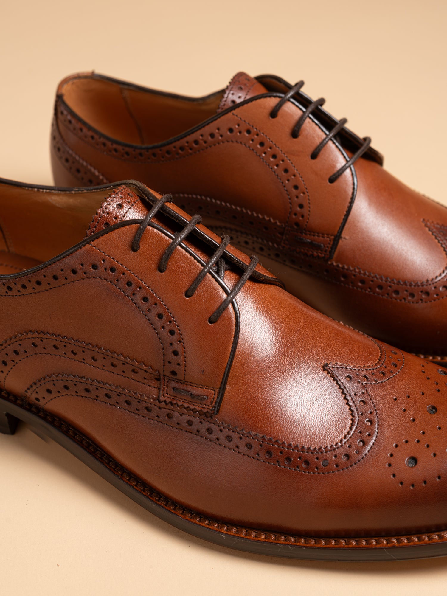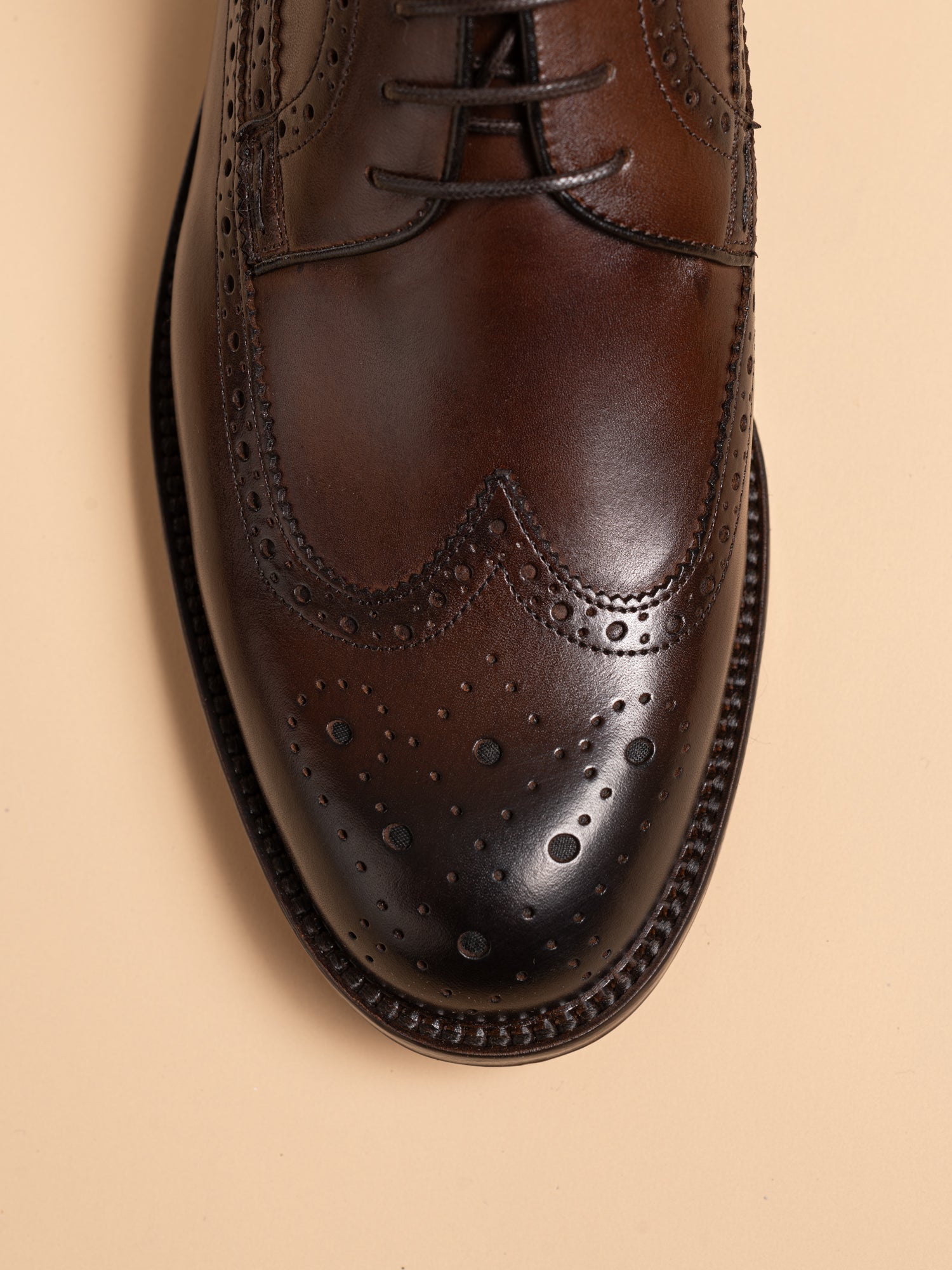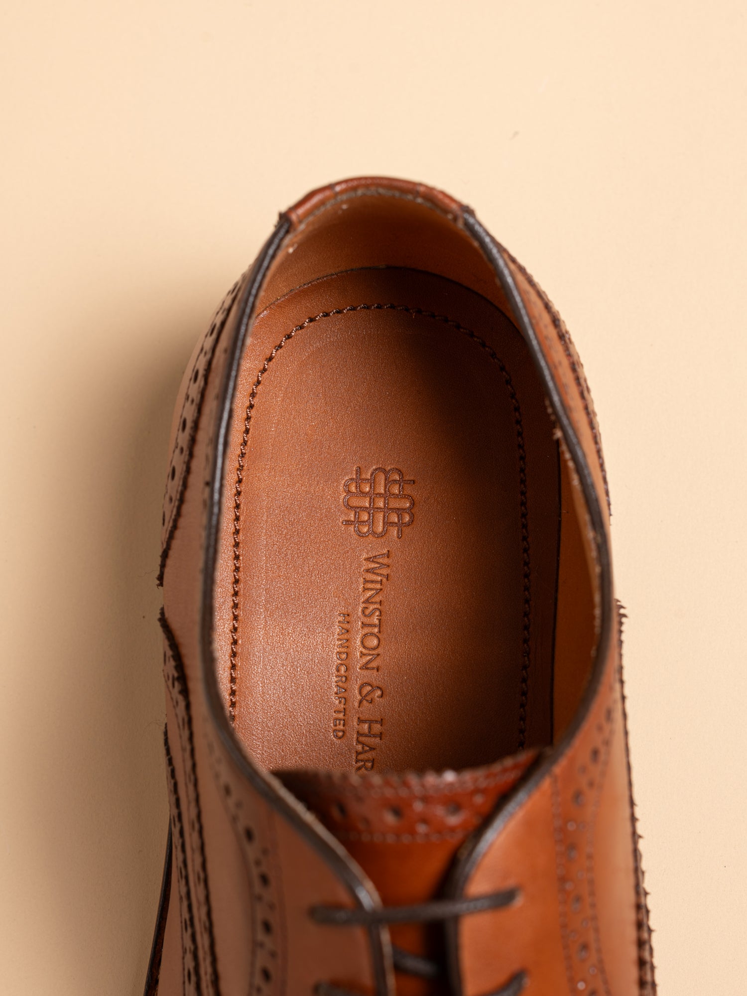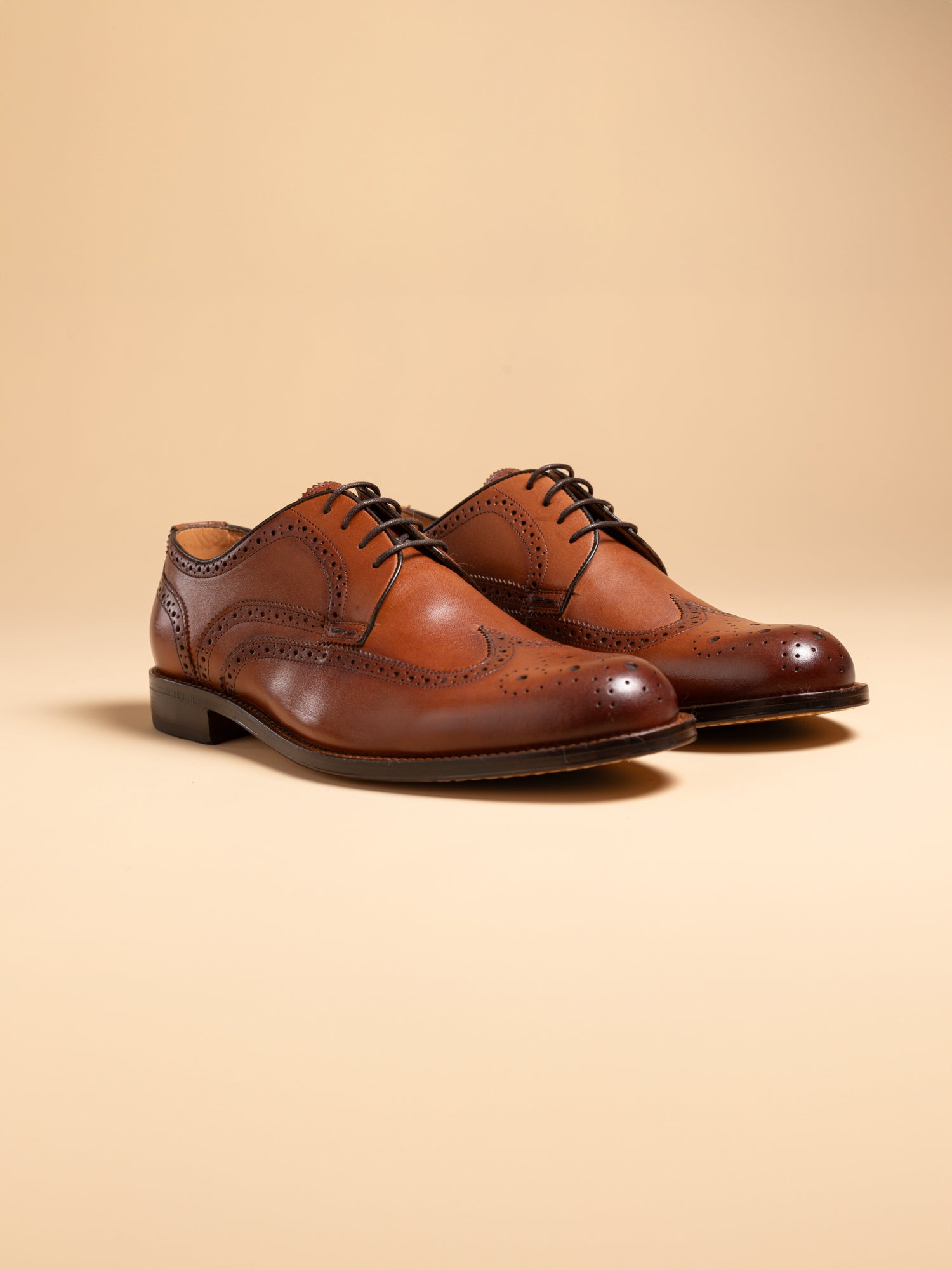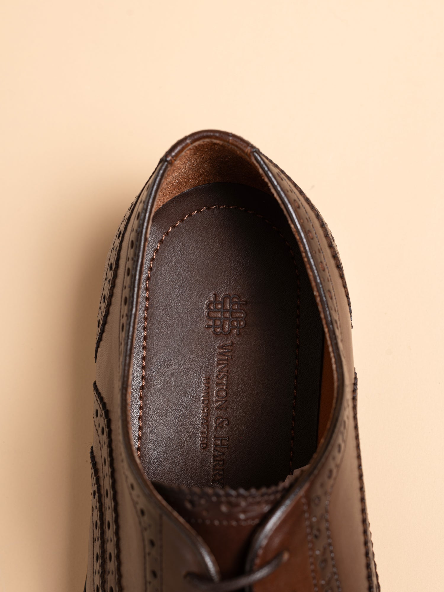 Our Derby Kent Shoes in the "Full Brogue" style are the ultimate example of British style. The particular design beautifully blends both contemporary and conventional fashion thanks to its meticulous handmade elements like the mustache (Wingtip), perforations, and seams at the end of the laces. This Kent will complement your everyday style whether you use it with jeans or formal trousers.