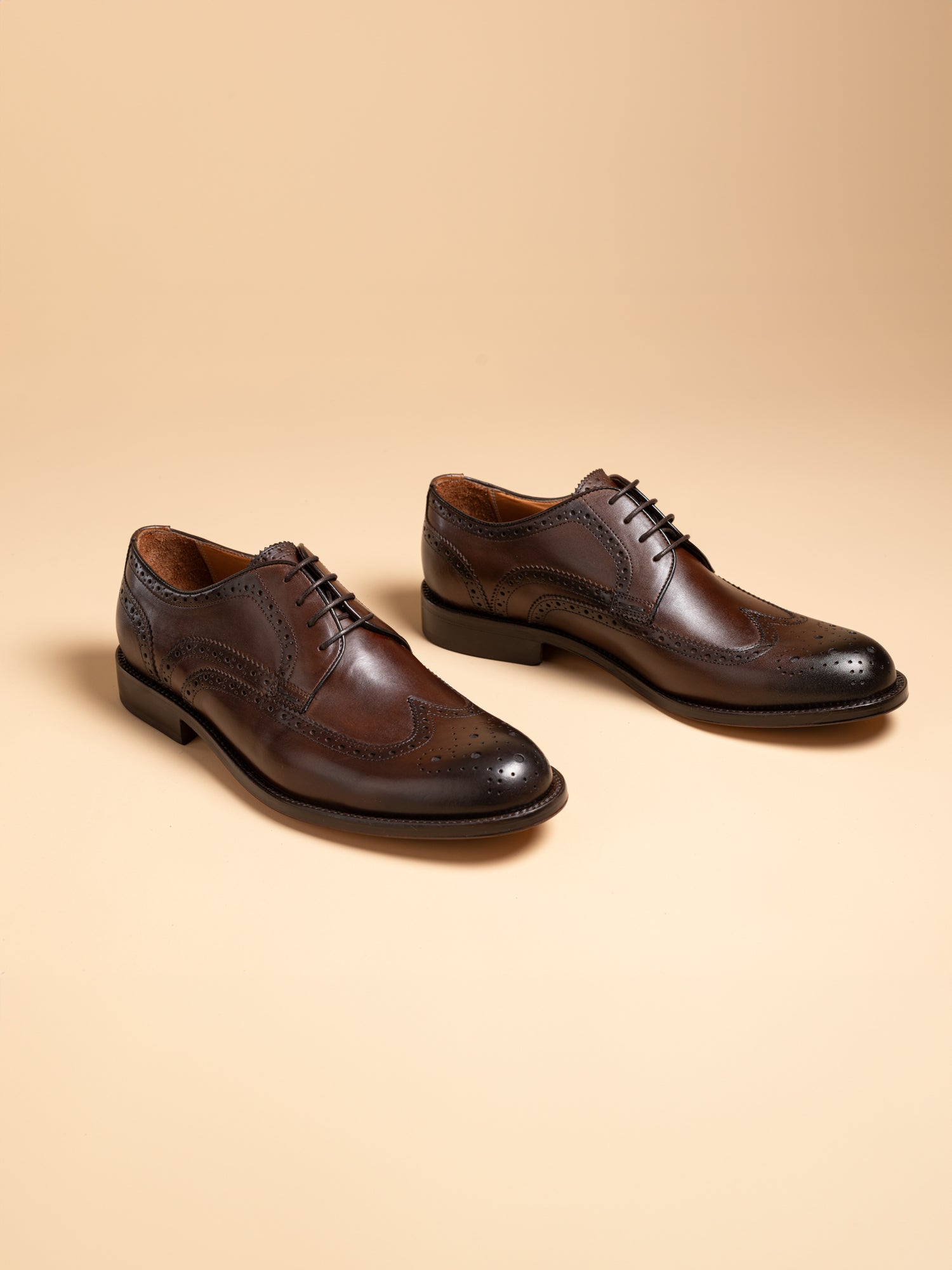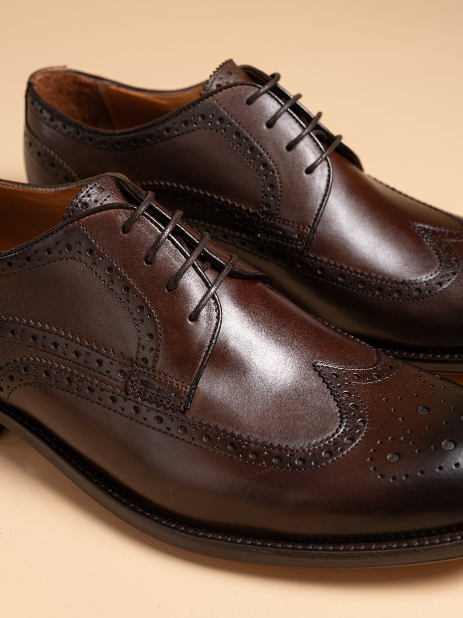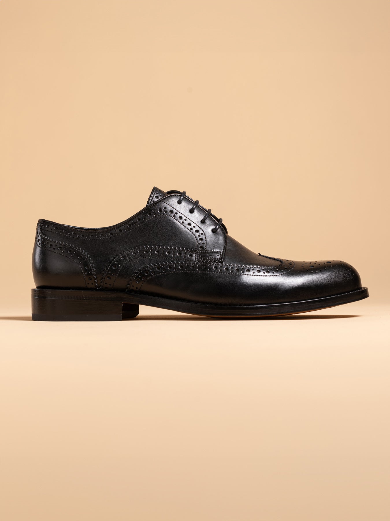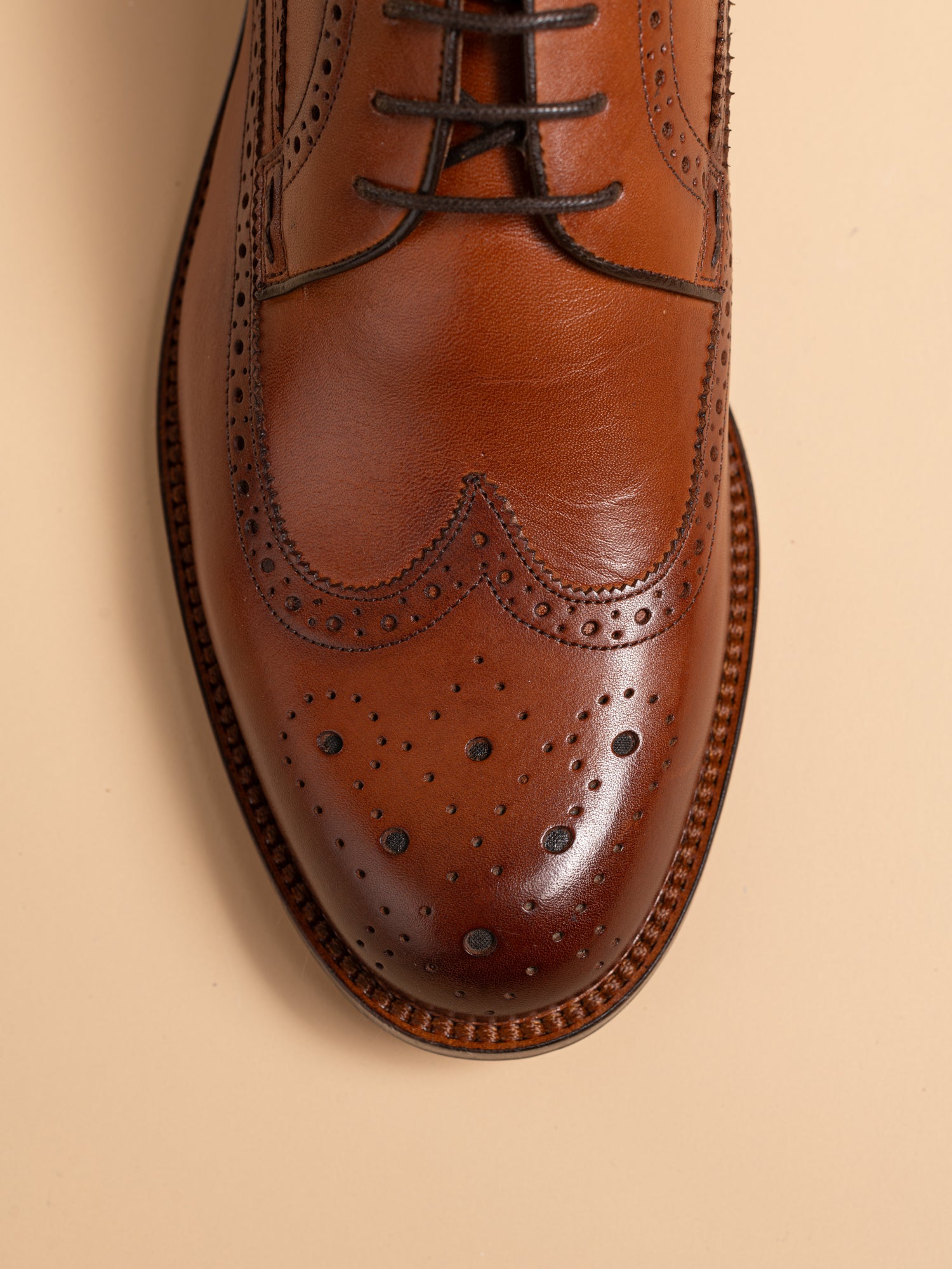Our Derby Kent Shoes in the "Full Brogue" style are the ultimate example of British style. The particular design beautifully blends both contemporary and conventional fashion thanks to its meticulous handmade elements like the mustache (Wingtip), perforations, and seams at the end of the laces. This Kent will complement your everyday style whether you use it with jeans or formal trousers.