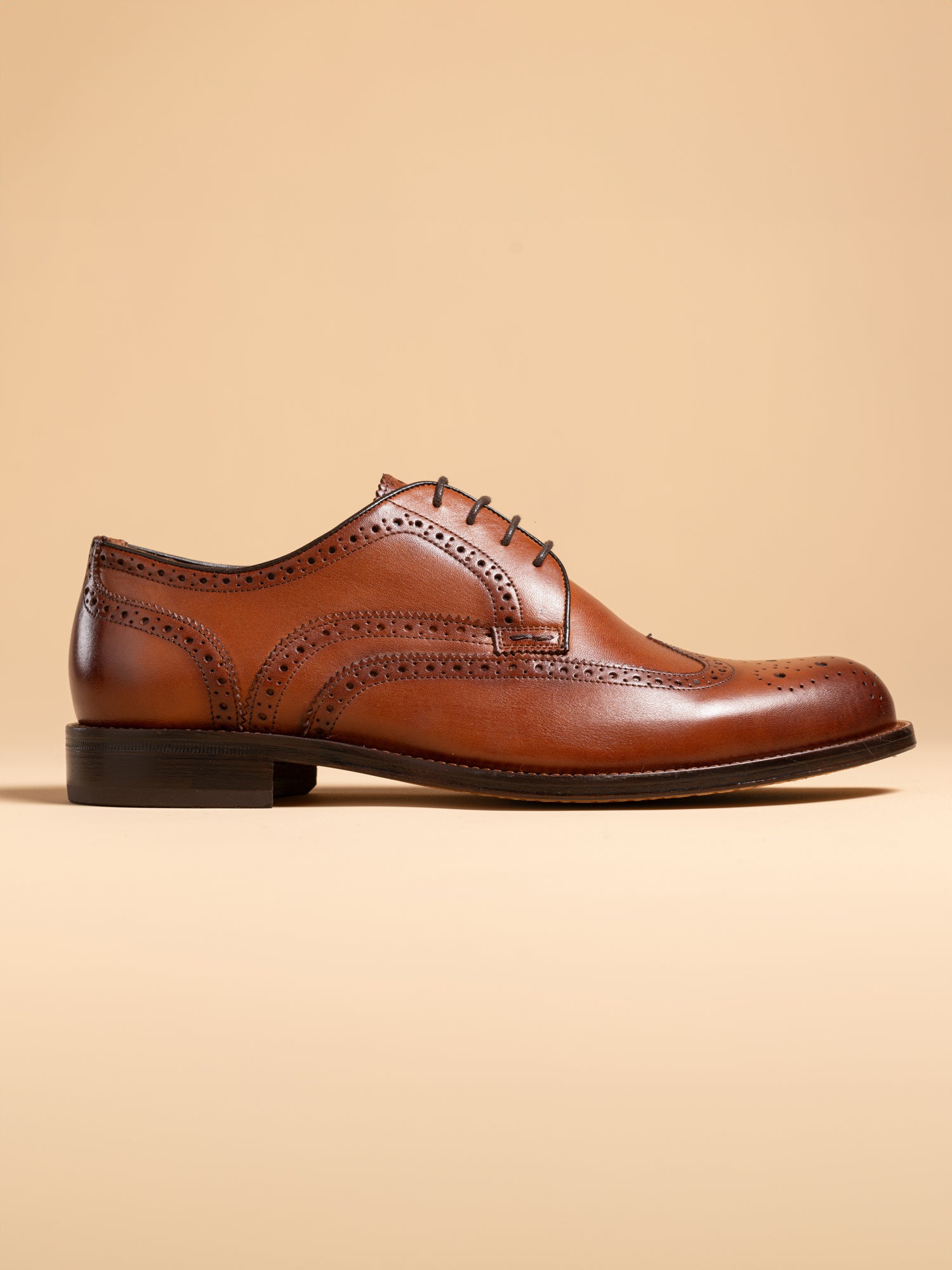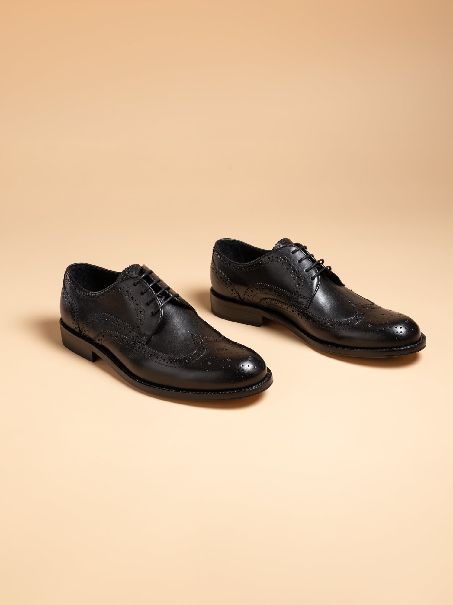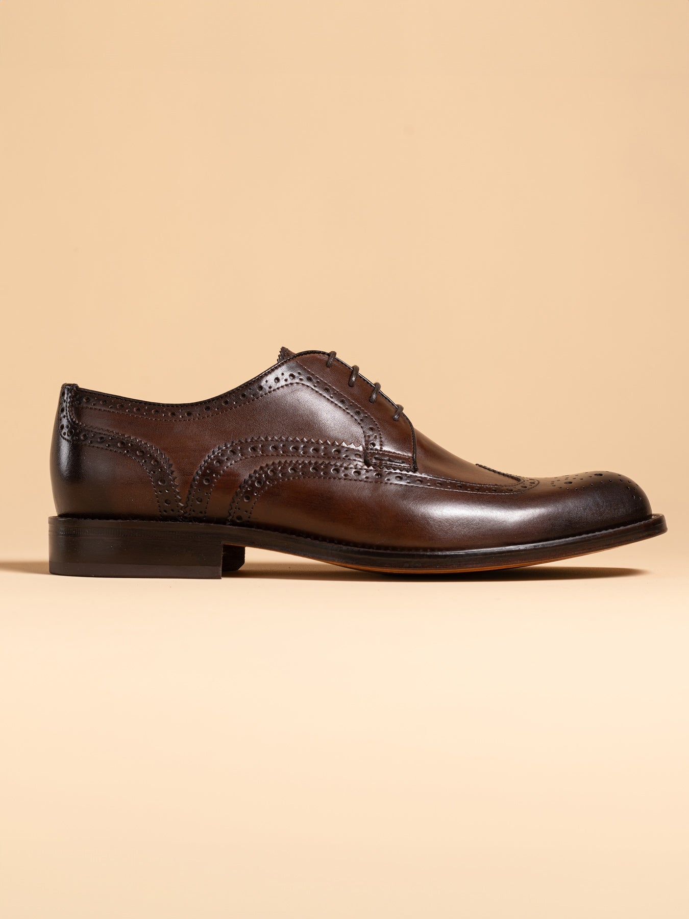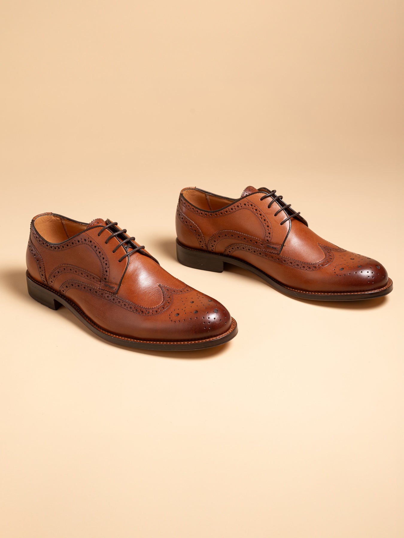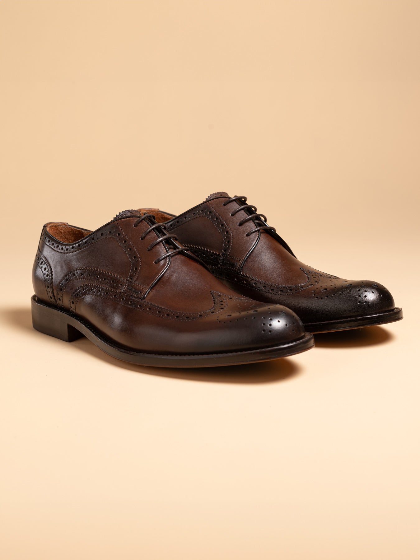 Our Derby Kent Shoes in the "Full Brogue" style are the ultimate example of British style. The particular design beautifully blends both contemporary and conventional fashion thanks to its meticulous handmade elements like the mustache (Wingtip), perforations, and seams at the end of the laces. This Kent will complement your everyday style whether you use it with jeans or formal trousers.